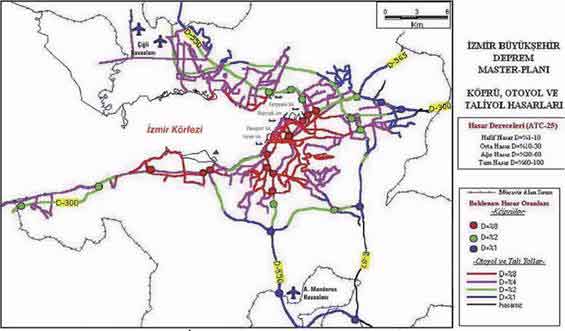 İzmir'de, ana arterler üzerinde yer alan otoyol köprülerinin, kavşakların ve viyadüklerin %80'ni senaryo depreminden elde edilen yer bağımlı deprem tehlikesi haritalarına göre, VIII ve IX Şiddet bölgelerinde yer almakta, dolayısıyla ATC-25 ölçeğine göre, sırasıyla hasar oranları %2 ve %8 olmaktadır.