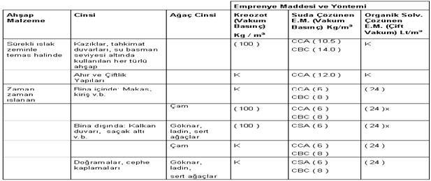Emdirilmesi gereken miktar, Ekteki tabloya göre seçilmelidir. Emprenye maddeleri, üreticisinin özel teknik şartnamesine ve ilgili standardına uygun olarak kullanılmalıdır. Bu teknik şartname kapsamındaki işler için TSE veya TSEK belgesine sahip olması gereken emprenye maddeleri ile TSEK belgesine sahip olan tesislerde emprenye edilmiş olması gereken ahşap malzeme, şantiyede gerekli işaret ve etiketleri tamam olarak bulundurulmalıdır.