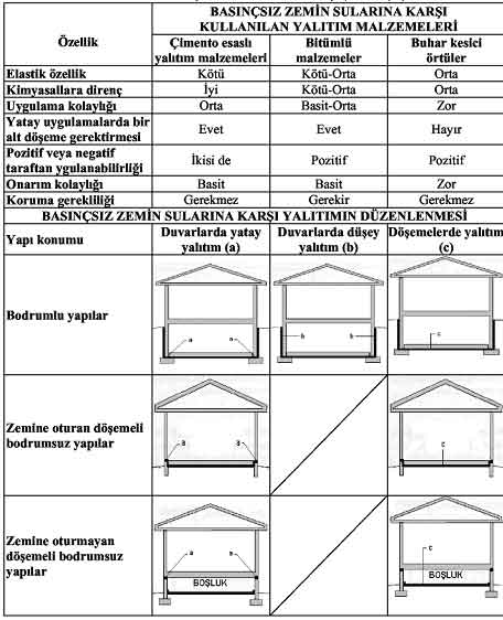 Basınçsız zemin sularına karşı yalıtımda, yapı konumuna bağlı bir yükseklikte duvarda bir yatay yalıtım yapılmakta ve bu yatay yalıtım bodrumlu yapılarda duvarlardaki düşey yalıtım ve döşemedeki yalıtım ile birleşmektedir. Zemine oturan döşemeli bodrumsuz yapılarda ise döşemedeki yalıtım ile birleştirilmektedir. Zemine oturmayan döşemeli bodrumsuz yapılarda zemin üzerine serilen buhar kesici örtünün temel duvarları ile birleştirilmesi yeterli olmaktadır (Tablo 4).
