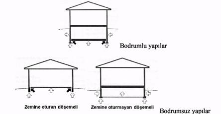 Zeminle temas eden yapı kabuğunu oluşturan yapı elemanlarının niteliği ahşap kapılar ve bu elemanlarda açılan delik ahşap pencereler ve boşluklar, nemin iç mekana geçmesine neden olur. Bodrumlu halı seçiminde dikkat edilecek konular ve bodrumsuz yapılarda nem ile ilişkili dış kabuk elemanları Şekil 2'de ifade edilmektedir.