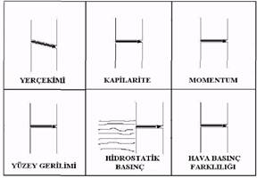 Sıvı akışı sonucu gerçekleşen su transferi; Zeminle ilişkili yapı elemanlarının bünyelerinde veya bu elemanlar arasında kalan konstrüksiyon boşlukları üzerinden su transferi ise çeşitli kuvvetlerin neden olduğu sıvı akışı sonucu gerçekleşmektedir (Şekil 4). Küçük boşluklarda kapiler kuvvetler etkin olurken, daha büyük boşluklarda farklı kuvvetler etkindir.