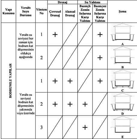 Yeraltı su seviyesinin bodrum kat döşemesinin yakınında veya üzerinde olması durumunda ise şu üç alternatif çözüm önerisinden birisi seçilir [9]: