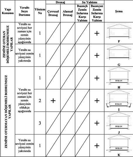Zemin ile yapı arasında gerçekleşen nem transferi sonucu oluşan nemlenmeyi ve dolayısıyla olumsuz etkilerini önleme yöntemleri Tablo l 'de verilmiştir. Tablo 1 'de görüleceği üzere, zeminden kaynaklanan nemlenmeyi önlemek için, yapının konumu ve yeraltı suyu durumuna göre farklı yöntemler kullanılmaktadır [2].