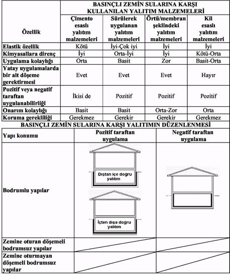 Basınçlı zemin sularına karşı yalıtım, sadece bodrumlu yapılarda uygulanmakta, diğer yapı konumlan için böyle bir uygulamaya gerek kalmamaktadır. Basınçlı zemin sularına karşı kullanılan yalıtım malzemeleri ile pozitif (su ile temas eden) veya negatif (su ile temas etmeyen) taraftan sürekli bir engel oluşturulması, basınçlı zemin sularına karşı yapılan yalıtımın esasını teşkil etmektedir. Bu tür uygulamalarda, yapılar, uygulama kolaylığı sağladığından genellikle plak temellerle yapılırlar. Pozitif taraftan uygulama, sağladığı yararların daha fazla ve daha önemli olması nedeniyle basınçlı suya karşı en uygun çözümdür. Negatif taraftan uygulamalar, çoğunlukla sonradan yapılan yalıtım uygulamalarında kullanılırlar (Tablo 3).