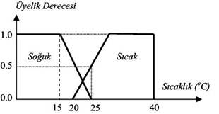 Şekil 2'ye göre sıcaklık azaldığında, daha az sıcak durum ortaya çıkacaktır. Yani 25ºC'lik sıcaklık az sıcak olarak nitelendirilirken 30ºC lik sıcaklık çok sıcak olarak nitelenecek, 20ºC� lik sıcaklık sıcak olarak sayılmayacaktır. Dolayısıyla, 20ºC'lik sıcaklık, sıcak bulanık kümenin bir elemanı olmayacaktır. Şekil 3'te ise bulanık mantık teorisinin bir adım daha ilerisi gösterilmektedir. Bu şekilden anlaşılacağı üzere sıcak bulanık küme üyelik derecesi 0.5'te soğuk bulanık küme üyeliği kimliğini kazanır. Soğuk bulanık küme üyeliğinin derecesi, sıcaklık azaldığında artar. Buna göre 0'dan 15 °C'ye kadar olan sıcaklık oldukça soğuk sayılır ve bu bölge soğuk bulanık küme tam üyeliğine sahiptir. 15ºC ile 25ºC arasında ise soğuk bulanık küme dereceli üyeliği vardır. 20ºC ile 25ºC arasında ise bulanık kümelerin birbirlerini kestiği örtüşüm ortaya çıkmıştır. Bu bölge hem sıcak hem de soğuk olarak düşünülebilmektedir.