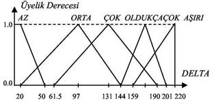 'DELTA' bulanık girdi değişkenine ait beş bulanık alt küme tanımlanmıştır. Bunlar, sırasıyla, 'AZ, ORTA, ÇOK, OLDUKÇAÇOK, AŞIRI� olarak isimlendirilmiştir. Bunlardan AZ ve AŞIRI isimli üyelik fonksiyonları için trapez, diğerleri için ise üçgen üyelik fonksiyonu seçilmiştir. Üyelik fonksiyonları birbiri ile örtüşmüştür. Üyelik fonksiyonlarının birbiri ile girişimi esnekliği sağlama açısından önemlidir.