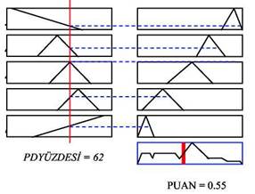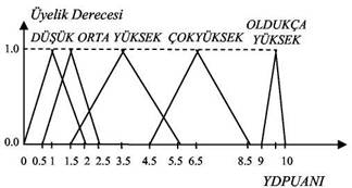 Bulanık çıktı değişkeni olan 'YDPUANI� ile ilgili beş bulanık alt küme tanımlanmıştır. 'DÜŞÜK, ORTA, YÜKSEK, ÇOK YÜKSEK OLDUKÇA YÜKSEK� olarak isimlendirilen bu alt kümelerin üyelik fonksiyonlarının tamamı üçgen olarak seçilmiştir.