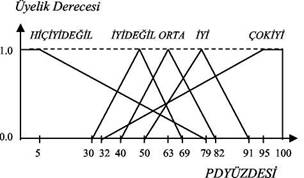 Bulanık girdi değişkeni olan 'PDYÜZDESİ� ne ait beş alt küme tanımlanmıştır. Bu alt kümeler, sırasıyla, 'HİÇİYİDEĞİL, İYİDEĞİL, ORTA, İYİ, ÇOKİYİ� olarak adlandırılmıştır. Bu bulanık alt kümelerden HİÇİYİDEĞİL ve ÇOKİYİ isimli üyelik fonksiyonları için trapez, diğerleri için ise üçgen üyelik fonksiyonu seçilmiştir.