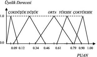 'PUAN� bulanık çıktı değişkeni ile ilgili beş alt küme tanımlanmıştır. Bu alt kümeler, 'ÇOK-DÜŞÜK, DÜŞÜK, ORTA, YÜKSEK, ÇOKYÜKSEK' olarak isimlendirilen bu alt kümelerin üyelik fonksiyonlarının tamamı üçgen olarak seçilmiştir.
