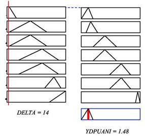 DELTA girdi değişkenine bir değer verildiğinde bu değer bazı kuralları tetiklemekte bazı kuralları ise tetiklememektedir. Tetiklenen kurallar, girdi değişkenlerinin üyelikleri oranında aynı kuraldaki çıktı değişkenlerini devreye sokmaktadır. Böylece her kural için elde edilen alanlar toplanarak kompleks bir şekil elde edilmektedir. Aslında çözüm kümesi bulunan bu şeklin tabanıdır. Fakat sonuçta tek bir değer elde edilmesi gerektiğinden bulunan bu bulanık çözüm kümesi durulaştırılmalıdır. Sonuçta elde edilen toplam şeklin ağırlık merkezi bulunmak suretiyle bir tek değer bulunarak durulaştırma işlemi yapılabilmektedir. Bazı katlar arası kalıcı yerdeğiş-tirme değerlerine karşılık gelen klasik ve bulanık mantık ile elde edilen puan değerleri Tablo 1 'de verilmektedir.