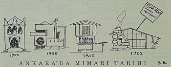 50�li yıllarda özel ya da kamu olsun, dişe dokunur yapılar artık Amerikan modernizminin hatlarını taşıyacaktır. Ülkenin yeni kimlik işaretleri, �minarelerden daha yükseğe� inşa edilmekle, kamuya görünür kılınmalıdır. Öte yandan, Türkiye�nin ilk �gökdelen� inşaatının, minareden yana fukara olan başkente nasip olması, sanki Ankara�ya minaresizliğini hatırlatmış gibidir. (Resim 13)