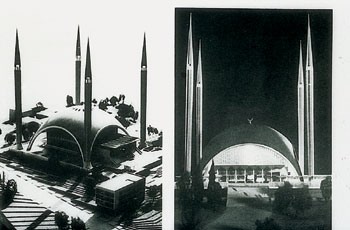 yenilikçi formu ve mütevazi boyutları nedeniyle engellenir. Atılan temel 1964 yılında sökülür; açılan ikinci yarışma, Osmanlı imparatorluk camisinin, yaratıcı bir dönüşüme hemen hiç uğramamış bir kopyasıyla �yani kalp üretimle� sonuçlanacaktır.(11) (Resim 18)