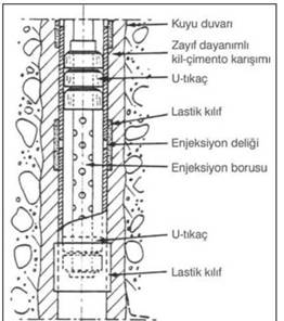 Tube a' Manchette, üzerinde yaklaşık 8 mm çaplı küçük deliklerin bulunduğu bölmelerden oluşan ve çapı 37.5 ve 62.5 mm arasında değişen çelik bir borudur. Delikli bölmeler yaklaşık 30 cm aralıklı olup tek yönlü vana gibi çalışan lastik kılıflarla kapatılmışlardır (Şekil 3). Muhafaza borusu yardımıyla enjeksiyon kuyusu istenilen tasarım derinliğine kadar açıldıktan sonra tube a' manchette kuyu içerisine indirilir. Daha sonra muhafaza borusu yukarı çekilir ve tube a' manchette ile kuyu duvarı arasındaki boşluk zayıf dayanımlı bir enjeksiyon malzemesi olan kil-çimento veya bentonit karışımıyla doldurulur. Asıl enjeksiyon işlemi ise tube a' manchette içerisine uç kısmı delikli ve U-tıkaçlarla kapalı olan küçük çaplı bir enjeksiyon borusu indirilerek gerçekleştirilir. Tıkaçlar tube a' manchette üzerindeki delikli bölmelerden herhangi biri üzerine merkezlenebilir. Enjeksiyon işleminin başlamasıyla beraber lastik kılıf ve tube a' manchette ile kuyu duvarı arasındaki zayıf enjeksiyon malzemesi yırtılana kadar enjeksiyon basıncı artacaktır. Lastik kılıfların tek yönlü çalışması enjeksiyon malzemesinin tube a' manchette içerisine geri girmesini engelleyecek, tube a' manchette ile kuyu duvarı arasındaki zayıf enjeksiyon malzemesi de meydana gelebilecek sızıntıları önleyecektir.