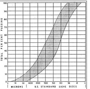 Şekil 5 - Kompaksiyon enjeksiyonu karışımındaki kumiçin öngörülen dane çapı dağılım aralığı (Warner &Brown, 1974)