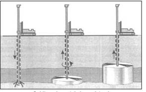 Bu enjeksiyon türünde tasarım derinliğine kadar, su kullanılarak delgi yapılmakta ve delgi için kullanılan tijlerin ucundaki nozullardan yüksek basınçlarda çimento şerbeti zemine jetlenmektedir. Bu jetleme esnasında tijler de belirli bir hızla döndürülmekte ve yine belirli bir hızla da zemin içinde aşağıdan yukarıya doğru çekilmektedir. Böylece, belirli bir çapta ve boyda zemin içinde silindirik bir kolon oluşturulmaktadır (Şekil 7). Jetleme esnasında kolon çapını artırabilmek için çimento jeti yanında hava ve su jetleri de kullanılabilmektedir. Buradaki mekanizmadan anlaşılabildiği gibi jet enjeksiyonu aslında bir enjeksiyon tekniği değil bir karıştırma yöntemidir. Sonuçta zemin içerisinde beton-zemin karışımı yüksek dayanımlı ve geçirimliliği düşük kolonlar elde edilmektedir. Bu yönüyle jet enjeksiyonu diğer enjeksiyon türlerinden kesin olarak ayrılmaktadır.